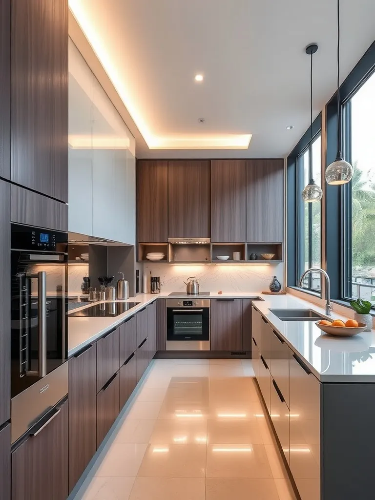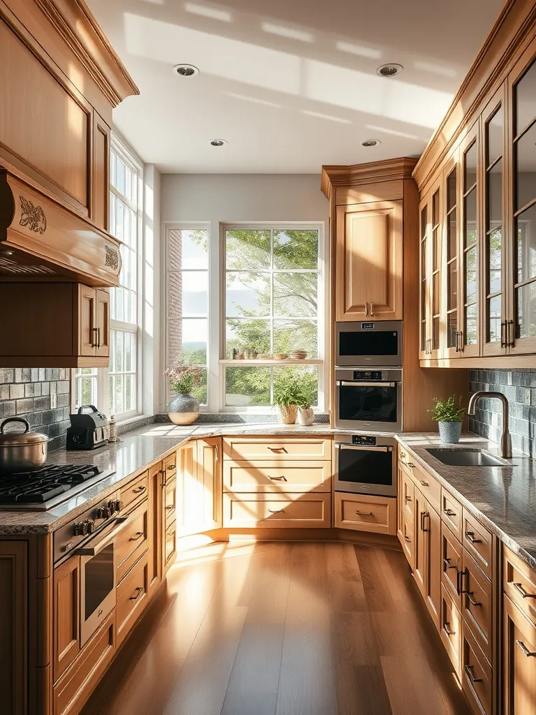 This image showcases a modern kitchen interior that features exquisite cabinetry, polished countertops, and state-of-the-art appliances.