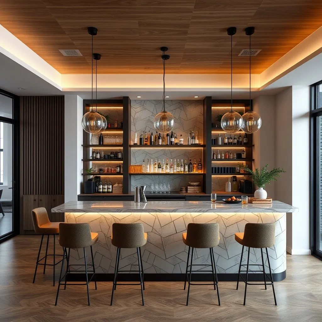 A stylish home bar with custom cabinetry, granite countertops, and ambient lighting, perfect for entertaining guests and enjoying evenings at home.